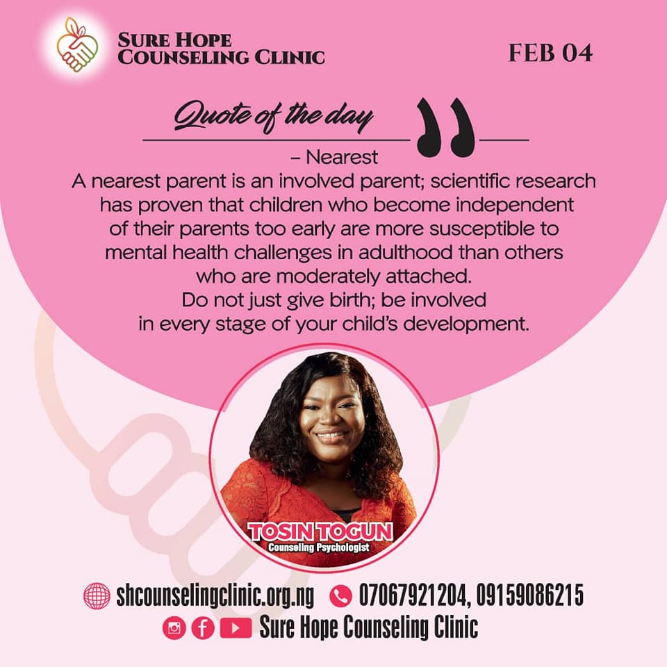 Likewise, a nearest parent is an involved parent. Where are you presently in the lives of your children? Are you involved in every stage of their development? Don’t part with your child too soon; research shows that children who become independent of their parents too early are more susceptible to mental health challenges in adulthood than other children who enjoy moderate attention from their parents.