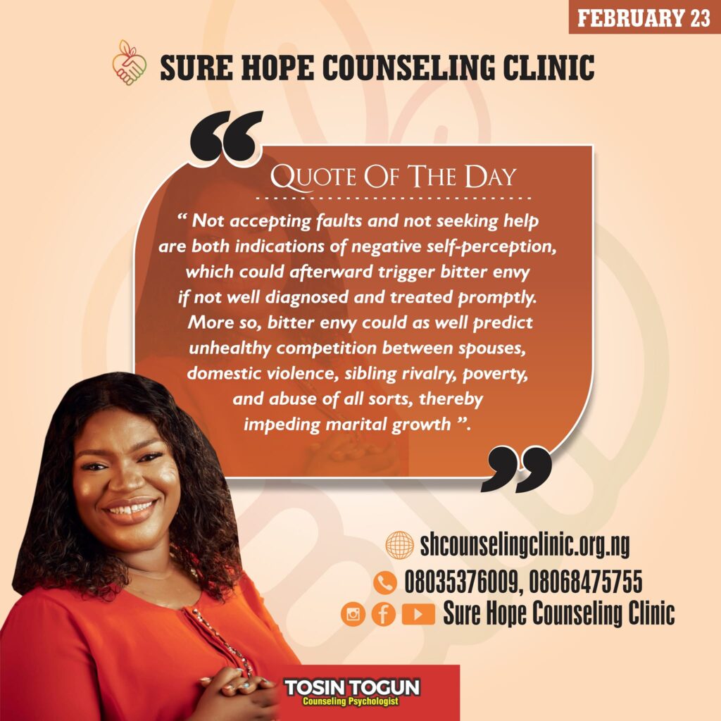 More so, bitter envy could as well predict unhealthy competition between spouses, domestic violence, sibling rivalry, poverty, and abuse of all sorts, thereby impeding marital growth.