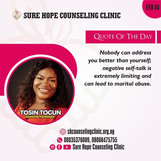 A person who is a victim of negative self-talk can continuously talk himself or herself out of success and marital peace, thereby limiting himself or herself from scaling heights and becoming a highly productive individual.
