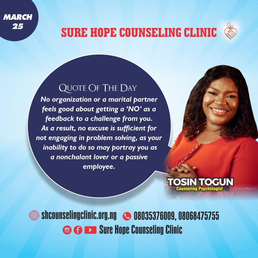 Problem solving skills involve being able to be aware of a problem, know its cause, think through the available alternatives or available options in solving the problem, weigh the consequences of each option available, and choose the one with lesser consequences. No organization or marital partner feels good about getting a “no” as feedback to a challenge from you.
